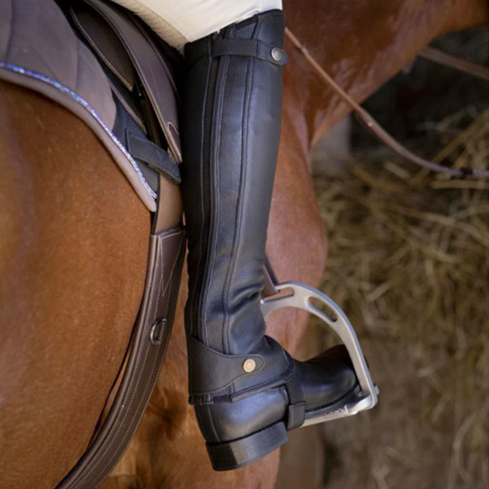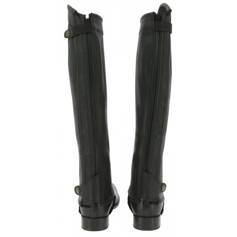 In full grain supple and finely grained cow leather, with decorative reinforcement in plain leather at the top of the shaft. Rear YKK zip set on elasticated leather base, secured with a press button on a leather tab at ankle, and an elastic strap on top. The ideal combination for a perfect fit around your calves and optimum comfort. Elasticated foot straps with leather reinforcements.