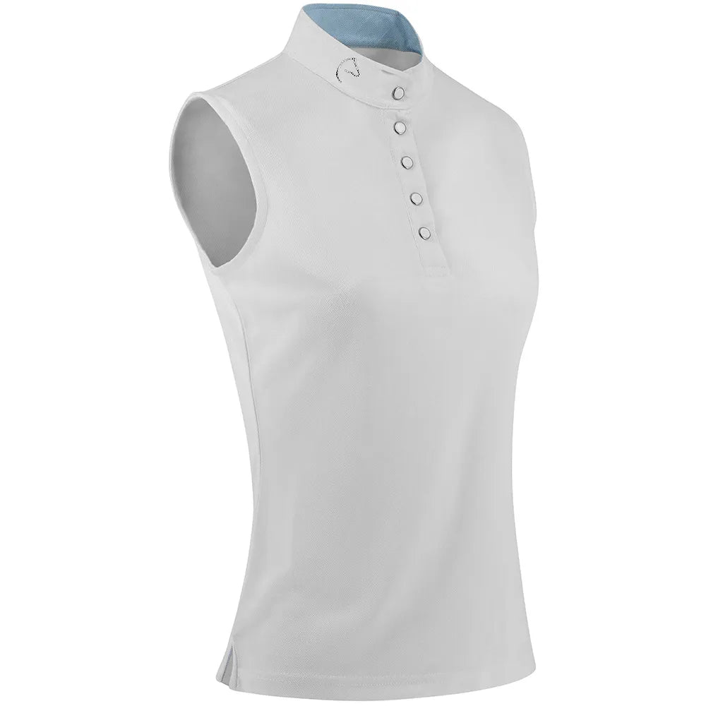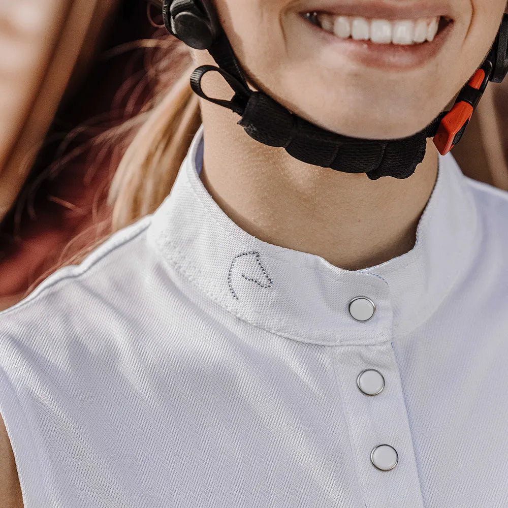 The EQUITHÈME Mesh Show Polo "Molly" is a lightweight, sleeveless competition shirt offering superior comfort and breathability for riders.