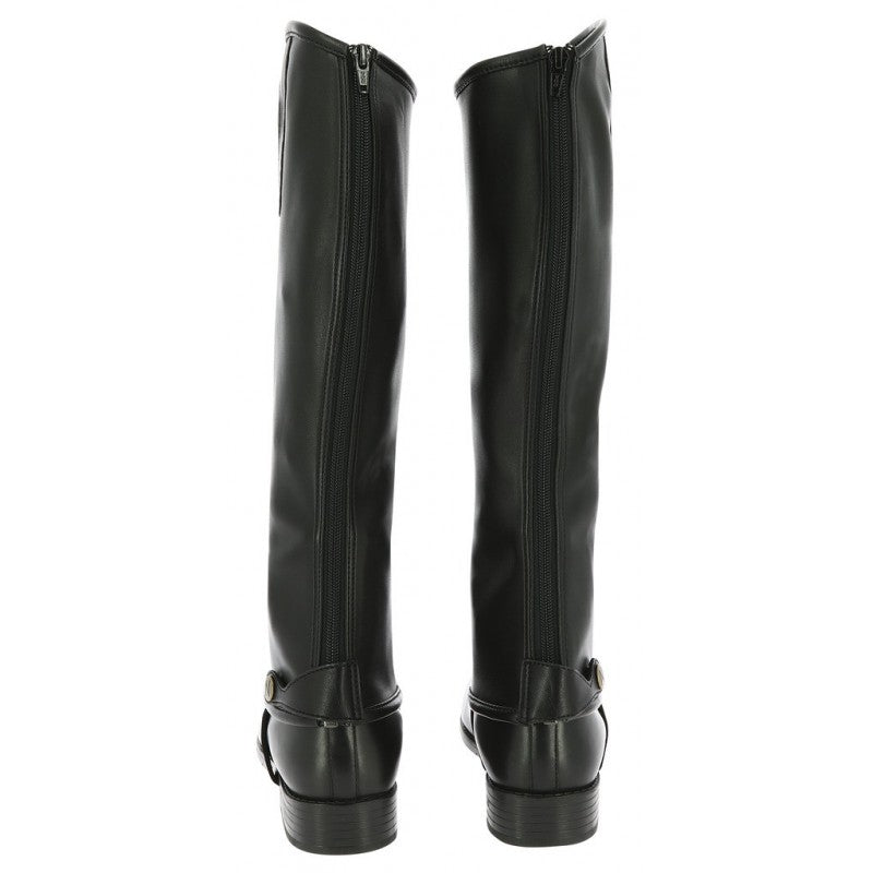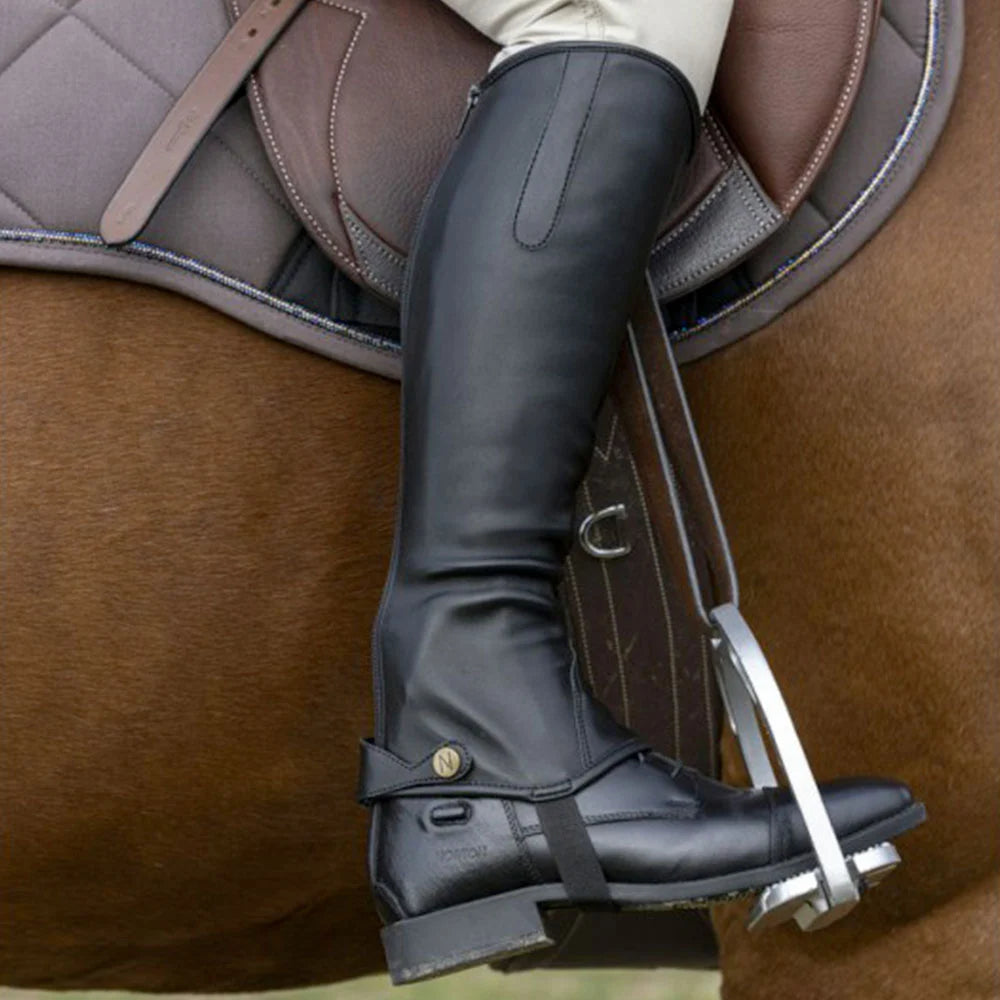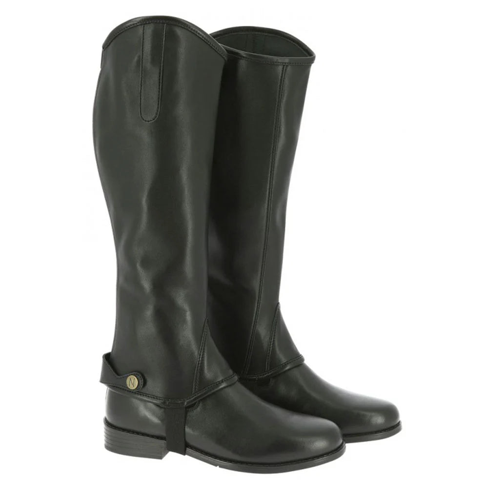 Shapely synthetic half-chaps in smooth leather-like polyurethane, thanks to its stretch texture lining in Micro Touch elastane. Elastic foot straps and rear YKK zips secured at ankle with press buttons on leather tab.