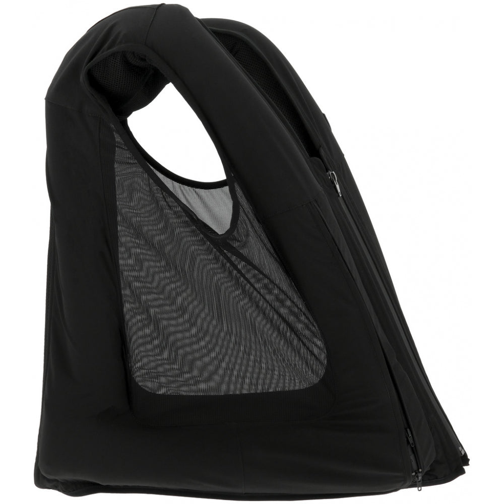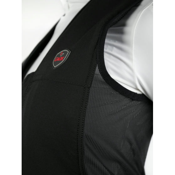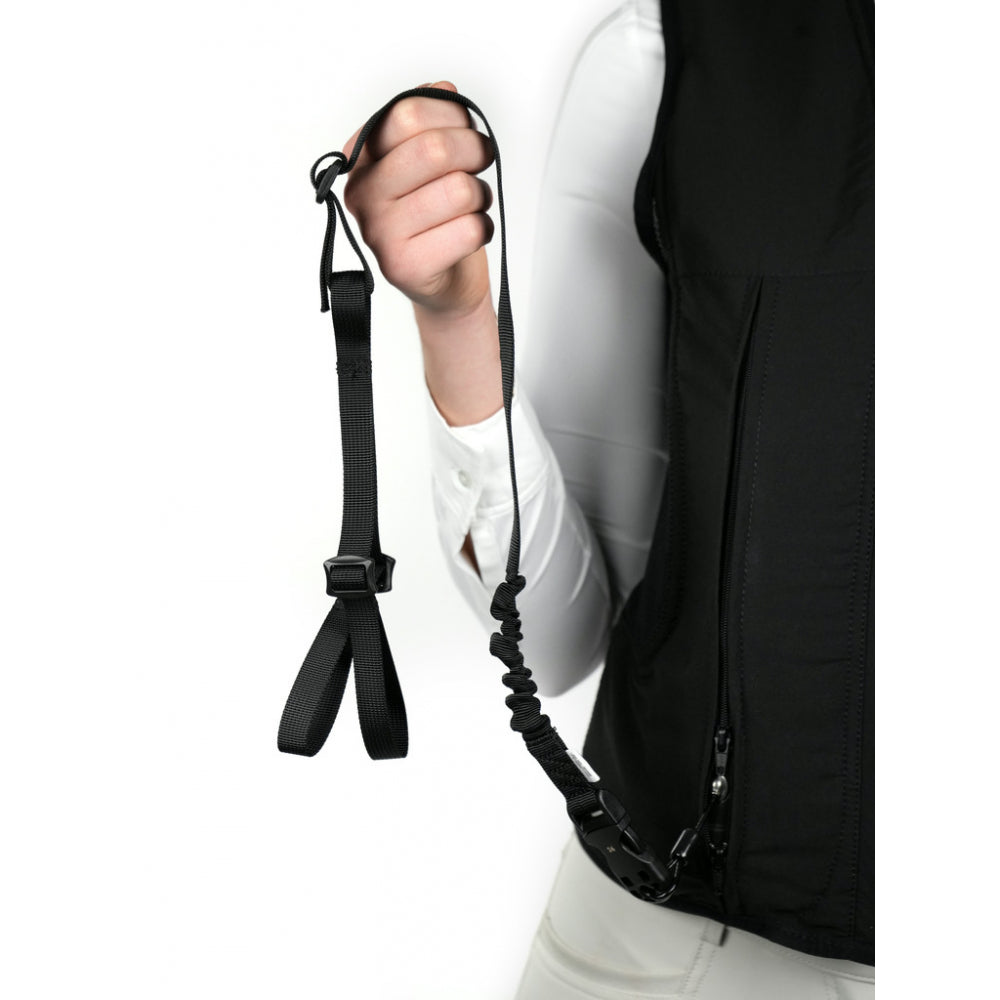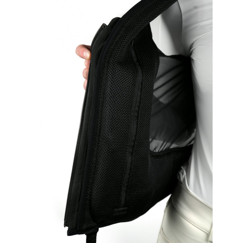 The vest attaches to the saddle via a hidden tether. In case of a fall, it activates in just 240 milliseconds, deploying air protection from the neck to the tailbone. The cut allows natural movement while ensuring maximum safety and ventilation, even in warm conditions.